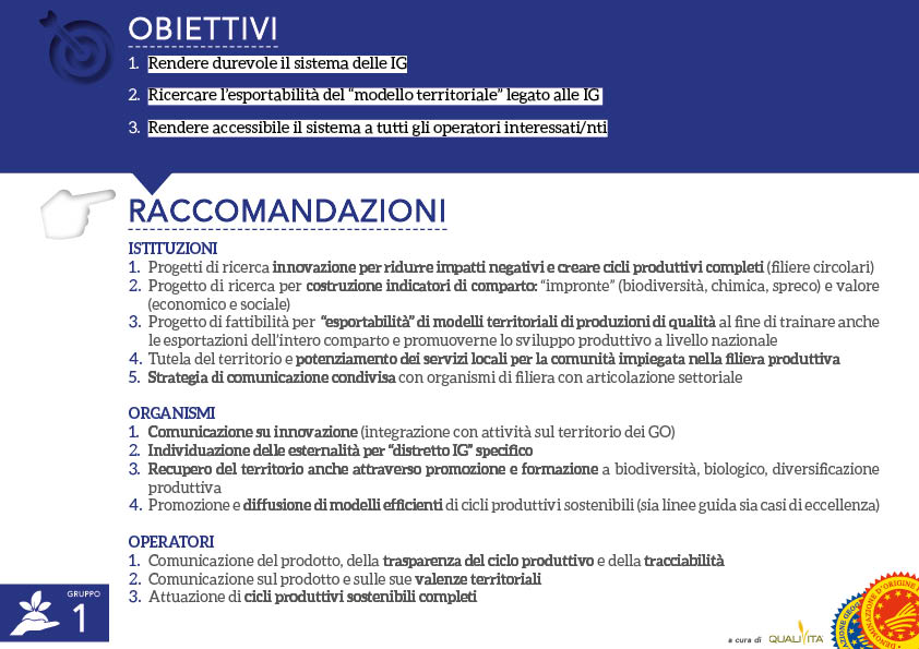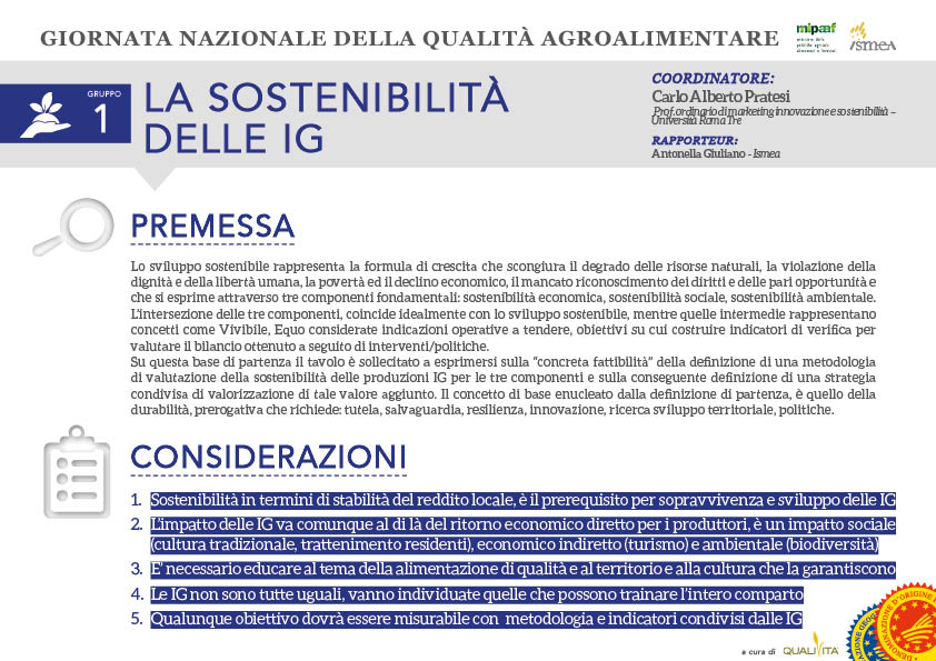 In questa sezione è disponibile, per la consultazione e il download, il report che sintetizza le istanze condivise dal gruppo di lavoro 1. La sostenibilità delle IG. Gli stakeholder sono invitati a leggere, commentare e condividere per sostenere un continuo sviluppo dell’agenda delle attività strategiche della qualità agroalimentare italiana.