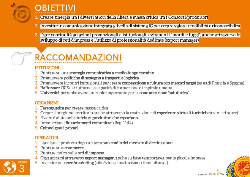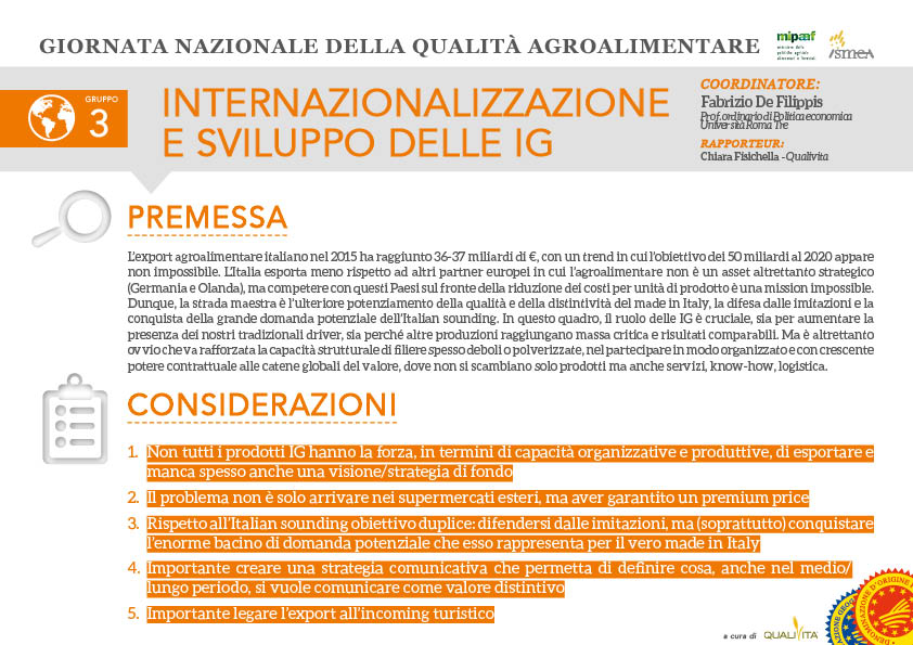 In questa sezione è disponibile, per la consultazione e il download, il report che sintetizza le istanze condivise dal gruppo di lavoro 3. Internazionalizzazione e sviluppo delle IG. Gli stakeholder sono invitati a leggere, commentare e condividere per sostenere un continuo sviluppo dell’agenda delle attività strategiche della qualità agroalimentare italiana.