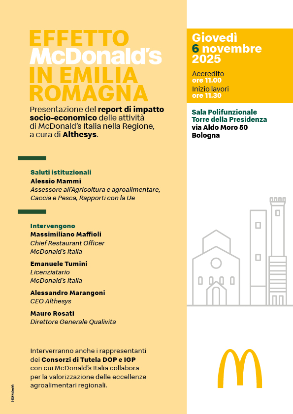 Giovedì 6 novembre 2025, McDonald’s Italia presenta il Report di impatto socio-economico delle attività di McDonald’s Italia nella Regione Emilia Romagna, a cura di Althesys. Durante l’evento interverrà il Direttore della Fondazione Qualivita, Mauro Rosati.