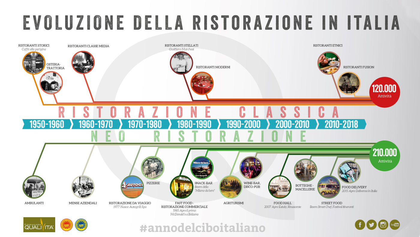 Se i ristoranti investono sulla qualità, gli italiani investono nei ristoranti. Dal Rapporto Fipe 2017 è emerso che i consumi delle famiglie per mangiare fuori casa sono in crescita (+3,5% dal 2006). Si spendono circa 81 miliardi, sui 227 della spesa alimentare totale, a fronte di un continuo calo di quella domestica (-10,5%). Soprattutto aumenta il numero delle attività di ristorazione veloce. Spuntano di tanto in tanto nuovi snack-bar, venditori ambulanti, street food, take-away e food delivery. Ben 210mila le attività di questo tipo, in aumento dell’8% negli ultimi cinque anni.