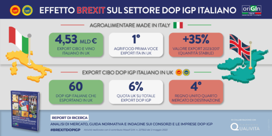 Pubblicato il report “Effetto Brexit sul settore italiano DOP IGP” realizzato da Origin Italia in collaborazione con Fondazione Qualivita per analizzare il quadro economico e normativo inerente il settore agroalimentare dei prodotti DOP IGP nel Regno Unito a quattro anni dalla sua uscita dall’Unione Europea.