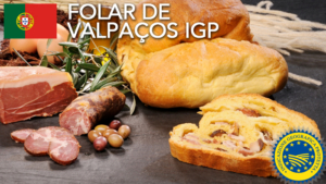 Descrizione dl Prodotto: Il Folar de Valpaços IGP è un prodotto di panetteria, di forma rettangolare, preparato con pasta di pane di frumento, uova, olio d’oliva di Trás-os-Montes DOP o avente caratteristiche organolettiche analoghe, margarina vegetale e/o strutto, farcito di carne di maiale grassa e/o diversi tagli di pancetta salata e secca (non affumicata), salumi e salsiccia di maiale affumicati («salpicão» e «linguiça»), prosciutto affumicato o a stagionatura naturale e/o spalla di maiale affumicata.