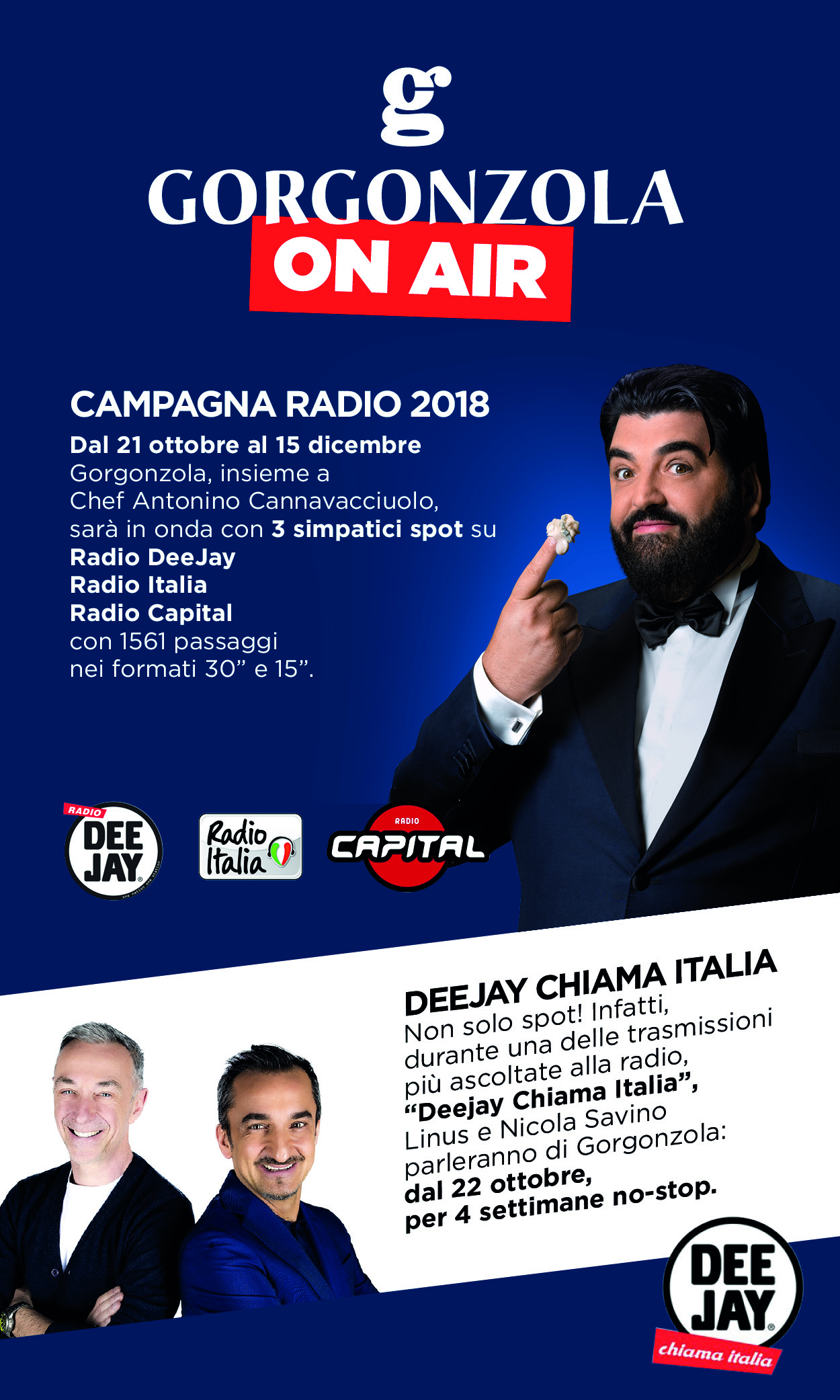 Dal 22 ottobre, invece, per quattro settimane no-stop, Linus e Nicola Savino,  parleranno di Gorgonzola DOP durante “Deejay chiama Italia“, una delle trasmissioni più ascoltate della radio.  I due conduttori racconteranno il formaggio Gorgonzola DOP in modo spontaneo, ironico e talvolta irriverente.