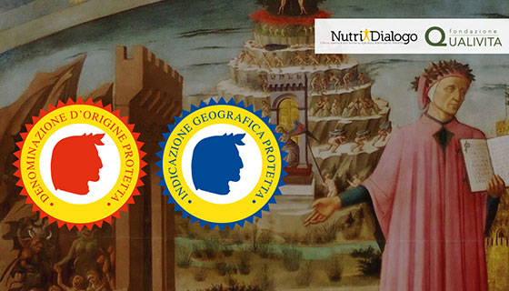 Tuttavia, citazioni come queste ci permettono anche di cogliere i tratti della toscana enologica del tempo, dove il vino bianco era riservato ai nobili e quello rosso destinato alle osterie. Inoltre, è a Dante che si deve il nome “Soave” del vino Soave DOP, così come la notorietà della Vernaccia, probabilmente proprio quella di San Gimignano, citata nel Purgatorio, XXIV (“…ebbe la Santa Chiesa in le sue braccia: dal Torso fu, e purga per digiuno l’anguille di Bolsena e la vernaccia”). Anche il Disciplinare di produzione dell’Aleatico di Puglia DOP riporta le parole con cui il Poeta descrisse quella “terra sitibonda ove il sole si fa vino”. Il lascito dantesco sui prodotti agroalimentari non è da meno. Si parte dal “liquor d’ulivi”, citato da un Dante che verosimilmente produceva nei propri possedimenti toscani quello che sarebbe diventato il celebre Olio Toscano IGP (Paradiso, XXI e Purgatorio, XXX), passando per i chiodi di garofano (“…e Niccolò che la costuma ricca del garofano prima discoverse ne l’orto dove tal seme s’appicca”, Inferno, XXIX), componenti essenziali del Panforte di Siena IGP, attestando la presenza consolidata del Panforte nelle tavole senesi, le anguille del lago di Bolsena PAT (Purgatorio, XXIV), senza dimenticare i celebri versi “tu proverai sì come sa di sale lo pane altrui” che attestano come Dante mangiasse in patria il pane sciocco che poi sarebbe diventato il Pane Toscano DOP (Paradiso, XVII) ed, infine, il latte “lor dolcissimo” utilizzato per la produzione di formaggi tipici (Paradiso, XXIII).