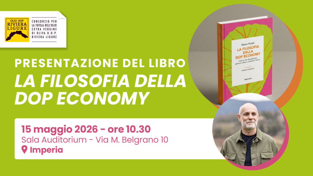 Il Consorzio di Tutela Olio EVO DOP Riviera Ligure ospiterà, il 15 maggio 2026 alle ore 10.30 presso la Sala Auditorium di Via M. Belgrano 10, Imperia, la presentazione del volume “La filosofia della Dop economy – Come il cibo di qualità può generare cultura, comunità e futuro” di Mauro Rosati, edito da Treccani.