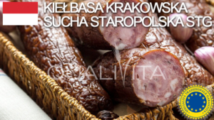 Aspetto e Sapore: All’aspetto si presenta nella tipica forma cilindrica di una salsiccia della lunghezza di circa 300 mm, con un budello naturale o in collagene del diametro di 50-70 mm. Il budello è uniformemente rugoso e di colore esterno marrone scuro, tipico dei prodotti affumicati. La superficie della salsiccia è lucida, lievemente rugosa e asciutta al tatto. Le estremità sono legate o unite da una chiusura metallica. Il sapore della Kiełbasa krakowska sucha staropolska STG è tipico della carne salata, affumicata e cotta, con note pronunciate di pepe e un retrogusto delicato di aglio e noce moscata. L’odore è quello tipico dei salumi molto affumicati con un leggerissimo aroma di aglio.