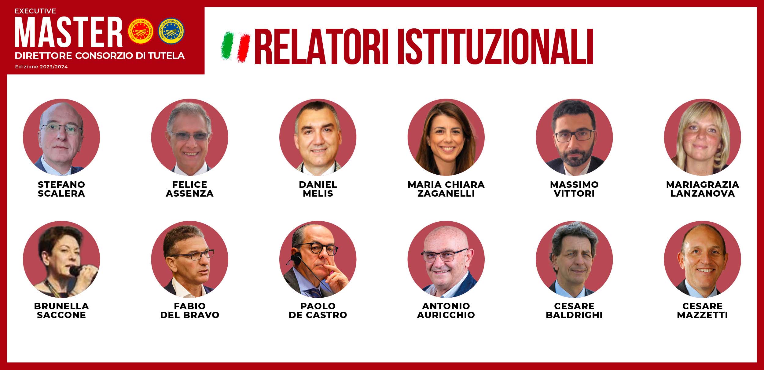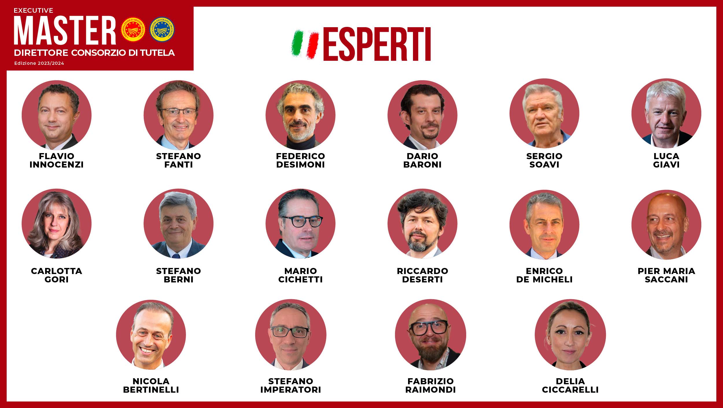 Le figure scelte per l’insegnamento hanno una specifica esperienza nel settore delle Indicazioni Geografiche e provengono Università, istituzioni nazionali ed europee e Consorzi di Tutela.