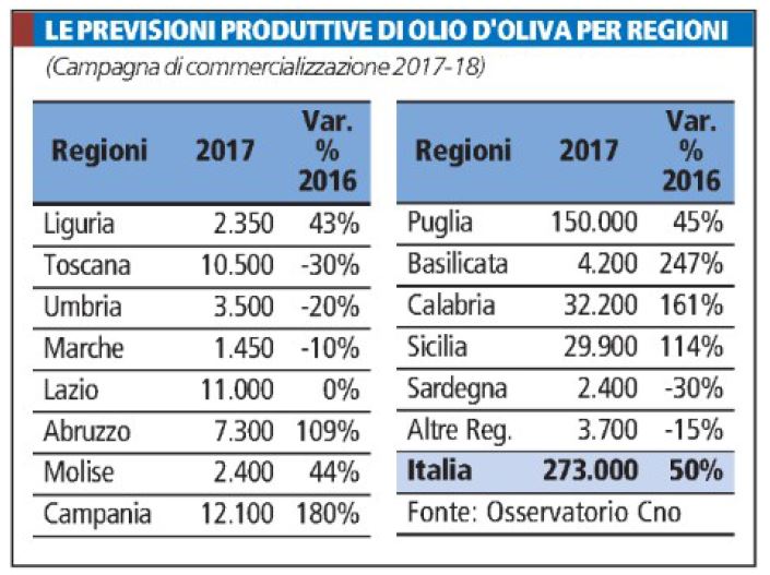 Entrando nel dettaglio regionale dei dati forniti dal Cno, la Puglia dovrebbe rimanere saldamente la regione leader in Italia con il 55% dell’intera produzione nazionale e con un incremento, rispetto all’anno scorso, del +45% della produzione. Balzo in avanti significativo rispetto al 2016 anche per altre Regioni del Centro e del Sud, come Calabria, Sicilia, Basilicata e Abruzzo, mentre Toscana (-30%) e Umbria (-20%), a causa della carenza idrica, ridurranno di molto la produzione. L’Italia, come già rilevato nei mesi scorsi, resta quindi ben al di sotto del suo potenziale e ai margini del podio della produzione mondiale visto che quest’anno dovrebbe essere anche sopravanzata dalla Grecia come secondo produttore alle spalle della Spagna..
