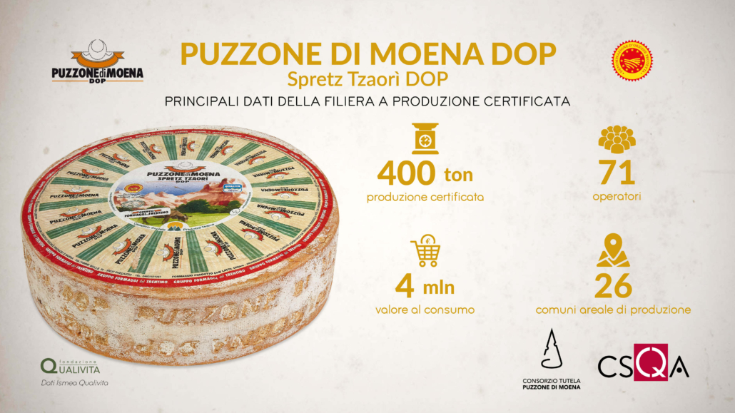 Il Puzzone di Moena DOP, tutelato anche con il nome in lingua ladina Spretz Tzaorì DOP, è una delle eccellenze del ricco paniere dei prodotti certificati del Trentino-Alto Adige, una regione che – nei comparti Cibo e Vino – può vantare 29 prodotti DOP IGP in grado di generare un impatto economico pari di oltre 1 miliardo di euro grazie al lavoro di 21.600 operatori (Dati Rapporto Ismea-Qualivita 2022).