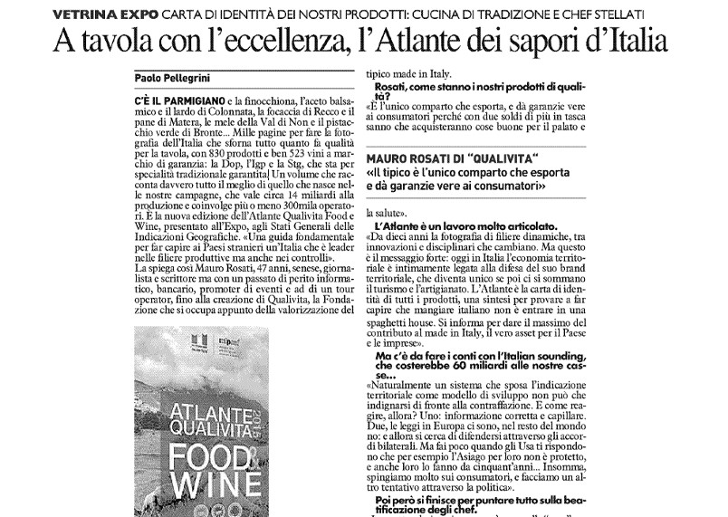 Atlante Qualivita 2015: c'è il Parmigiano e la finocchiona, l'aceto balsamico e il lardo di Colonnata, la focaccia di Recco e il pane di Matera, le mele della Val di Non e il pistacchio verde di Bronte... Mille pagine per fare la fotografia dell'Italia che sforna tutto quanto fa qualità per la tavola, con 830 prodotti e ben 523 vini a marchio di garanzia: la Dop, l'Igp e la Stg, che sta per specialità tradizionale garantita.