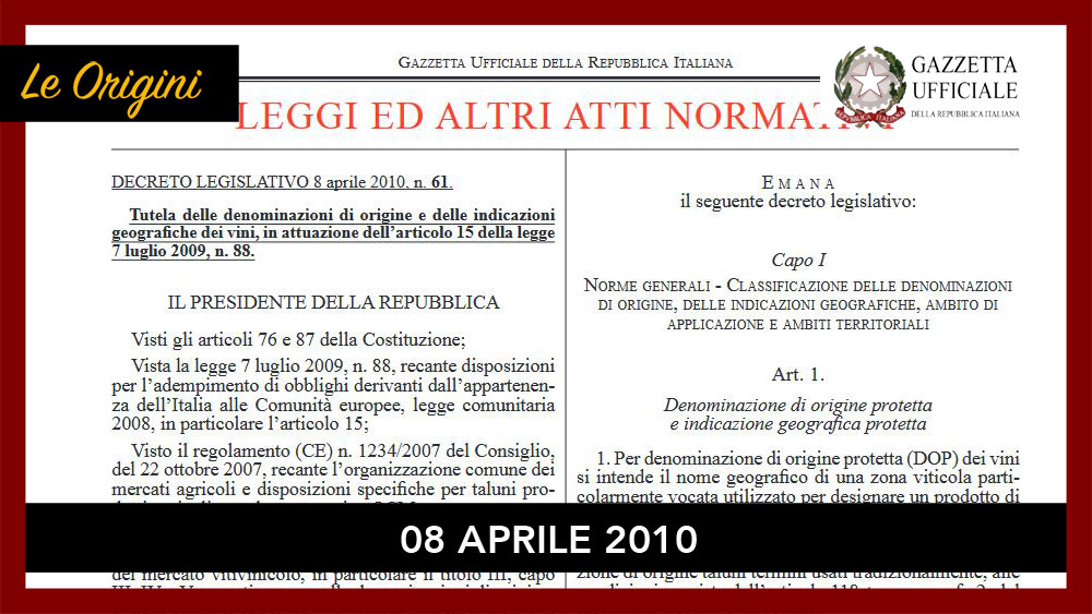 Il Decreto legislativo 61/2010, con cui è stata revisionata a livello nazionale la precedente Legge 164/1992 ulle Denominazioni d’Origine dei vinistabiliva che i vini DOCG e DOC dovessero confluire nella categoria dei vini DOP, mentre i vini IGT dovessero essere identificati attraverso l’acronimo già previsto per gli analoghi prodotti alimentari (IGP).