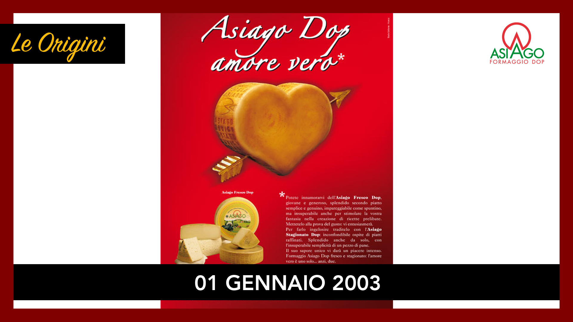 Nel 2003, il Consorzio Tutela Formaggio Asiago ha lanciato la campagna "Asiago DOP Amore Vero" per valorizzare l’Asiago DOP e le sue due tipologie fresco e stagionato, raccontandone le peculiarità organolettiche.