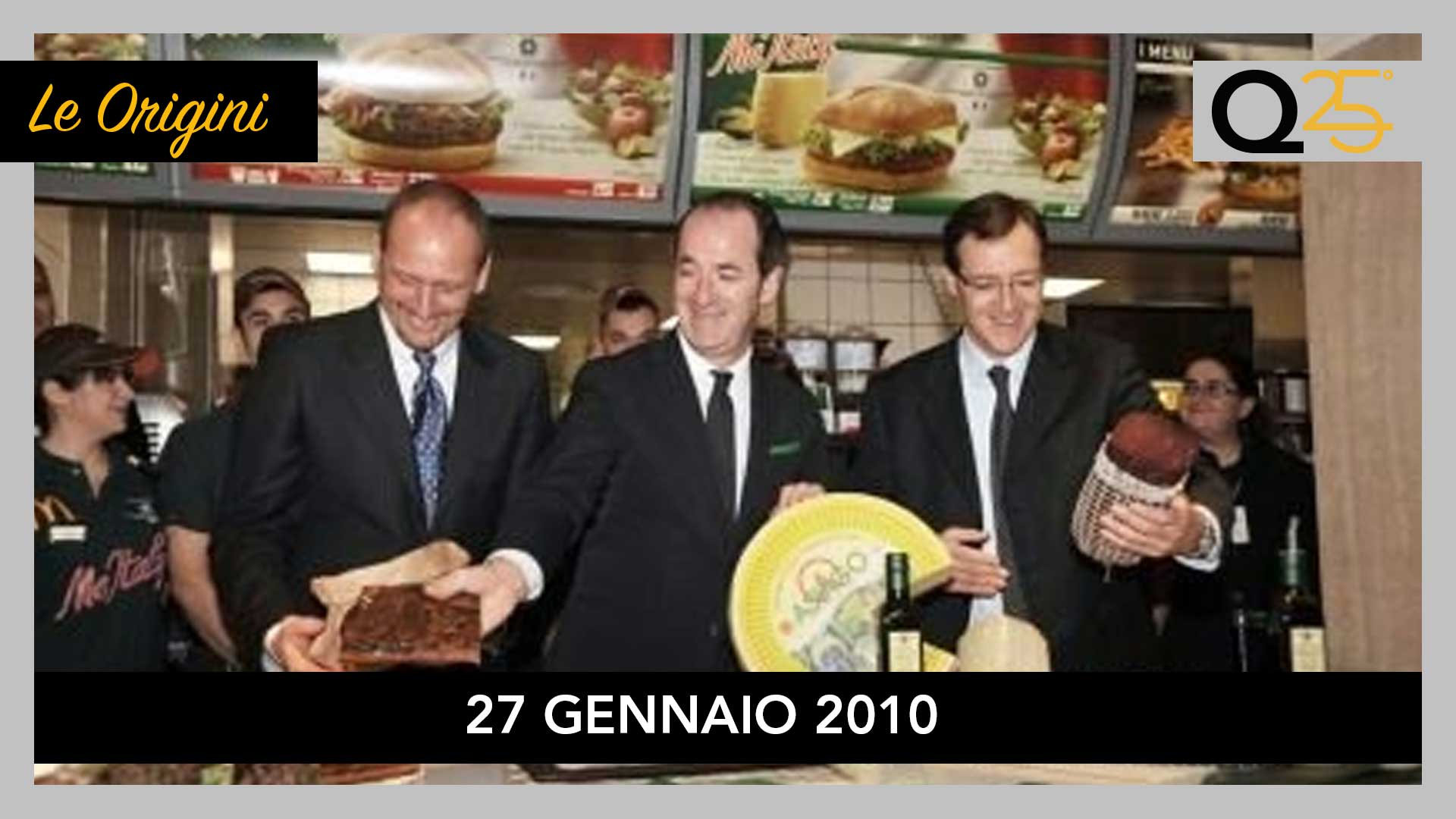 Nasce McItaly, la nuova linea di McDonald’s 100% made in Italy, con carne e olio extra vergine italiani e prodotti certificati come l’Asiago DOP e la Bresaola della Valtellina IGP e inizia la collaborazione di Qualivita con McDonald’s, con il progetto patrocinato del Ministero delle politiche agricole. È una svolta storica, perché a partire dall’esperienza italiana anche in altri parti del mondo si avvia un processo di regionalizzazione dei menù di McDonald’s con i prodotti locali nazionali.