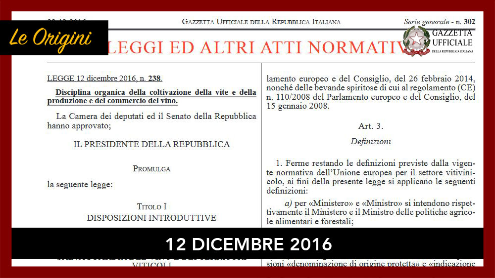 La Legge 12 dicembre 2016 n. 238 prevede, in particolare, che ripetto ai Vini a Denominazione di Origine Protetta e a Indicazione Geografica Protetta possano continuare a essere utilizzate le menzioni DOCG, DOC, IGT, quali menzioni tradizionali, a seguito della consuetudine del loro utilizzo nel linguaggio comune.