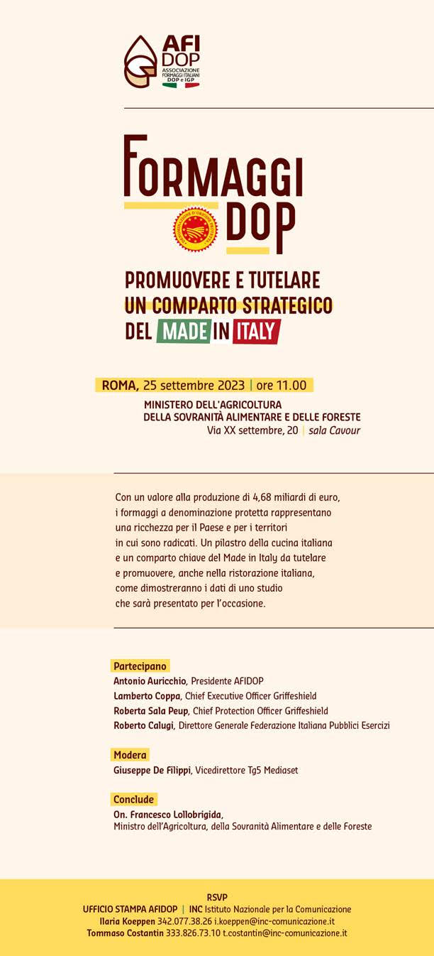 Lunedì 25 settembre, a partire dalle ore 11.00, presso il Ministero dell’agricoltura della sovranità alimentare e delle foreste (Via XX settembre 20, Roma), si terrà l’evento “Formaggi DOP – Promuovere e tutelare un comparto strategico del Made in Italy”.