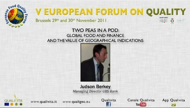 Judson Berkey, di UBS Bank, al V Forum Qualivita con l’intervento dal titolo Two Peas in a POD:global food and finance and the value of Geographical Indications.