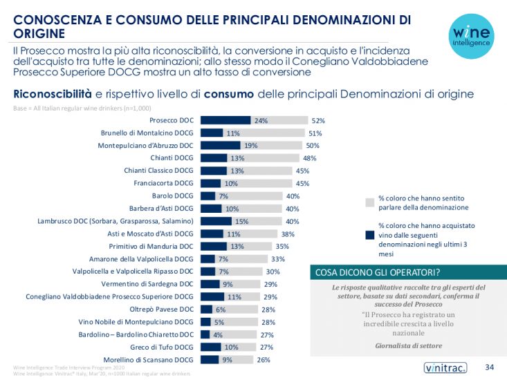 Per il vino in Italia, le denominazioni più conosciute sono il Prosecco DOP (52% la percentuale di chi ha sentito parlare della denominazione), Brunello di Montalcino DOP (51%), Montepulciano d’Abruzzo DOP (50%), Chianti DOP (48%), Chianti Classico DOP (45%), Franciacorta DOP (45%), Barolo DOP (40%), Barbera d’Asti DOP (40%), Lambrusco DOP (40%), Asti e Moscato d’Asti DOP (38%), seguiti da Primitivo di Manduria DOP, Amarone della Valpolicella DOP, Valpolicella DOP, Vermentino di Sardegna DOP, Conegliano Valdobbiadene – Prosecco DOP, Oltrepò Pavese DOP, Nobile di Montepulciano DOP, Bardolino DOP, Greco di Tufo DOP e Morellino di Scansano DOP.