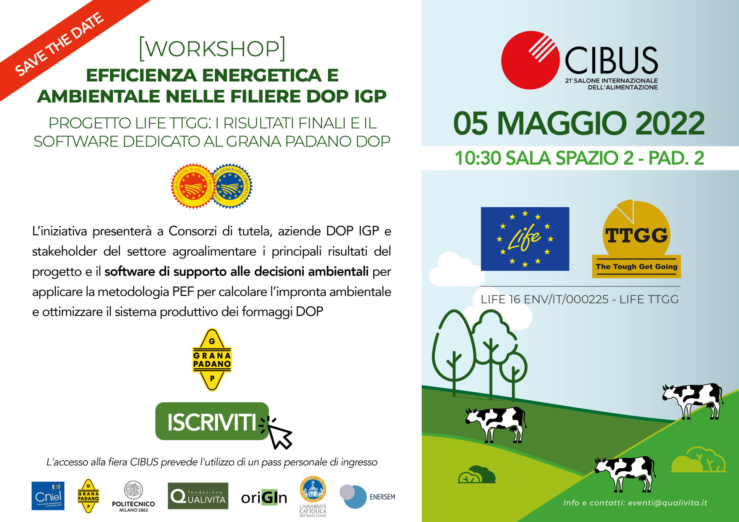 In data 5 maggio 2022 alle ore 10.30, presso la Sala Spazio 2 – Padiglione 2 di Cibus, si terrà il workshop “Efficienza energetica e ambientale nelle filiere DOP IGP– Progetto Life TTGG: i risultati finali e il software dedicato al Grana Padano DOP” organizzato da Fondazione Qualivita e Consorzio Tutela Grana Padano in collaborazione con Politecnico di Milano, Università Cattolica del Sacro Cuore di Piacenza, oriGIn, Enersem e CNIEL.